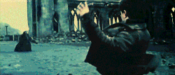 Harry runs through a dusty seventh-floor corridor. When he hears a noise out of his line of sight, he turns and fires an explosion at it. He then runs and hides near the main staircase just as Voldemort Apparates with Nagini in tow. With a basilisk fang in hand, Harry comes out of his hiding spot and fires a Stunning Spell at Voldemort, which he blocks. The Dark Lord then fires Killing Curses at Harry, which Harry blocks, due to the Elder Wand's unwillingness to kill Harry. After firing a barrage of Killing Curses, Voldemort Disapparates behind Harry, and Harry barely blocks a Killing Curse with his Disarming Charm; the two spells meet and clash. Voldemort advancing on Harry, with Nagini ready to attack. Harry throws the tendrils above into the ceiling causing a large explosion and the ceiling to collapse in front of Voldemort. Harry turns to see Nagini and is ready to stab her with the basilisk fang when Voldemort releases a shockwave of dark energy. Harry narrowly evades it by jumping off the staircase. Voldemort destroys the basilisk fang with a Killing Curse and attempts to fire one at Harry. Harry begins to run as Voldemort turns to black smoke and flies after him.